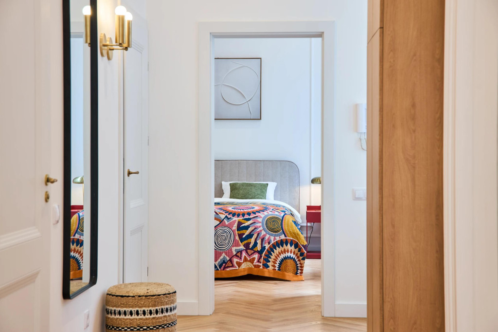 Világos, déli tájolású, 1. emeleti lakás liftes, szép házban, csodás utcai kilátással. A nappali három ablakán keresztül csendes mellékutcára nyílik kilátás, a terek tágasak és napfényesek.