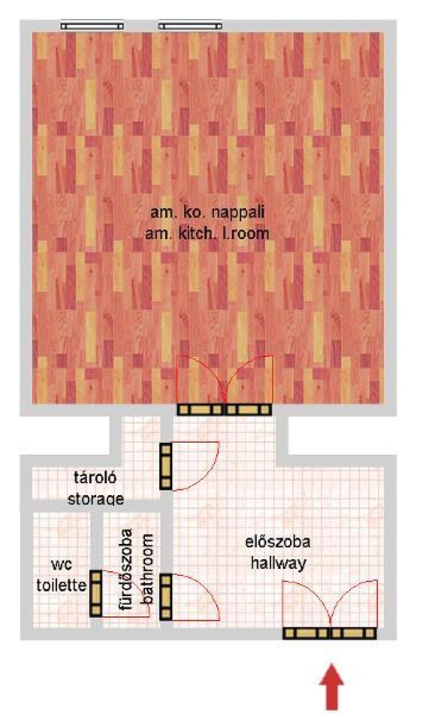 Alapterület: 61 nm, jelenleg 1 szobás, de könnyedén nappali+1 hálóssá alakítható.
