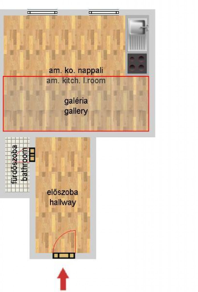 A 45 négyzetméteres lakás egy tágas amerikai konyhás nappaliból és a 25 négyzetméteres galérián kialakított 2 hálószobából áll, így ideális otthon lehet egy párnak vagy egy kisebb családnak. A nappali nagy ablakai természetes fényt engednek be, így az egész lakás világos és barátságos hangulatot sugároz.