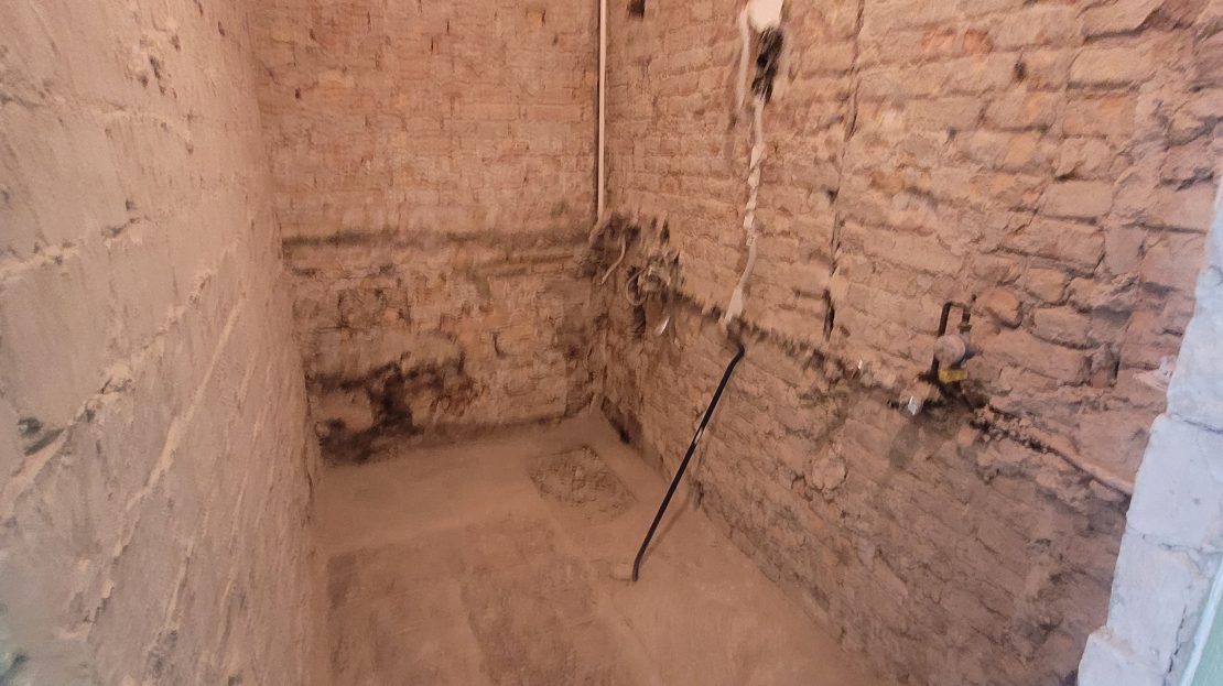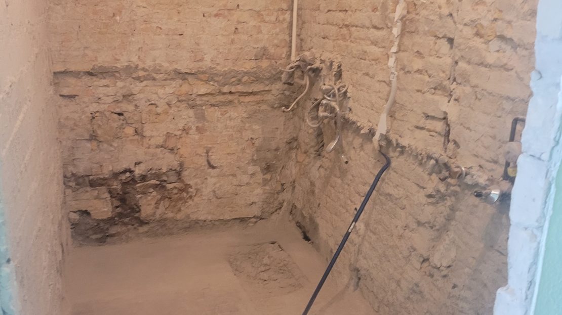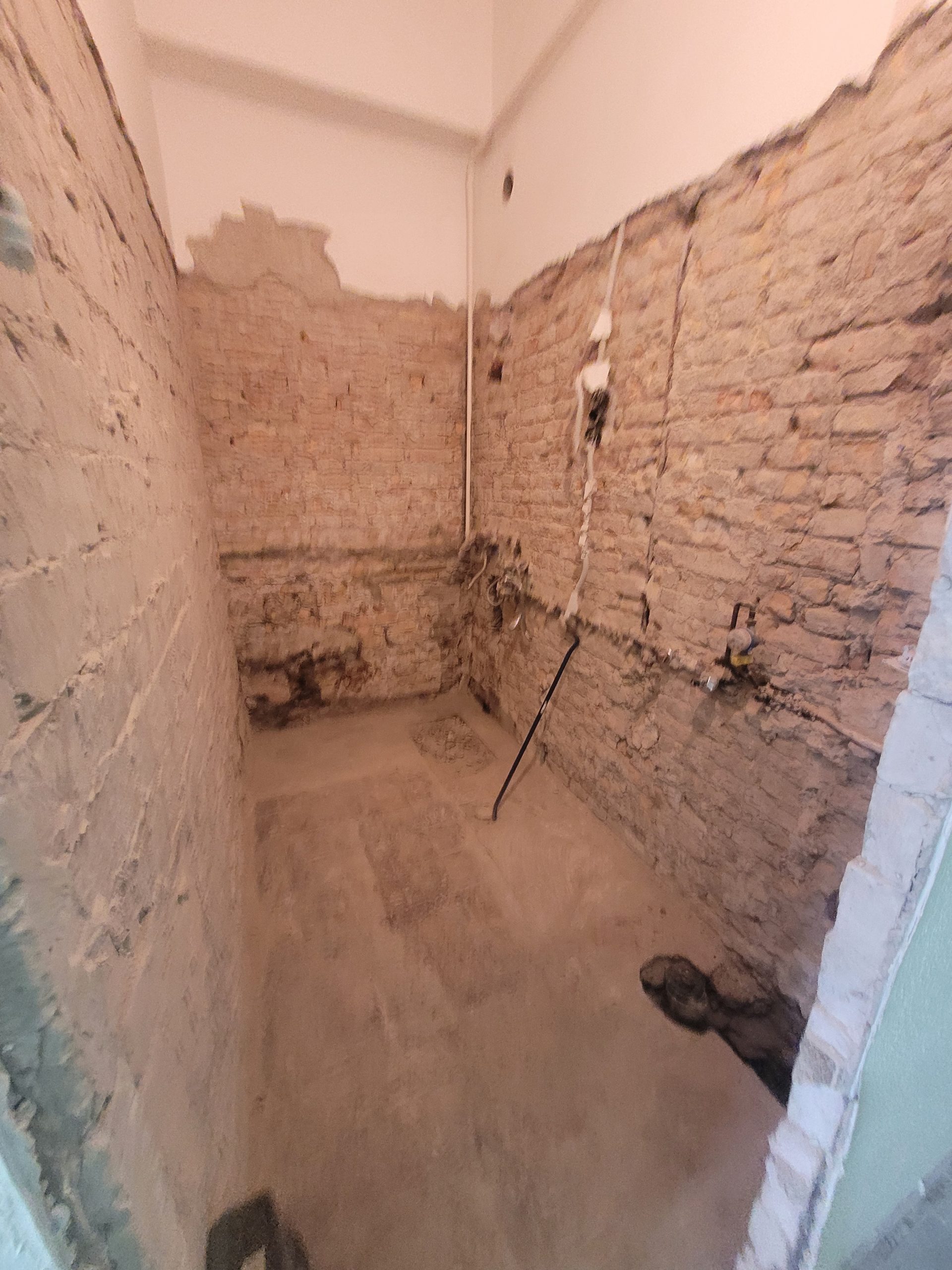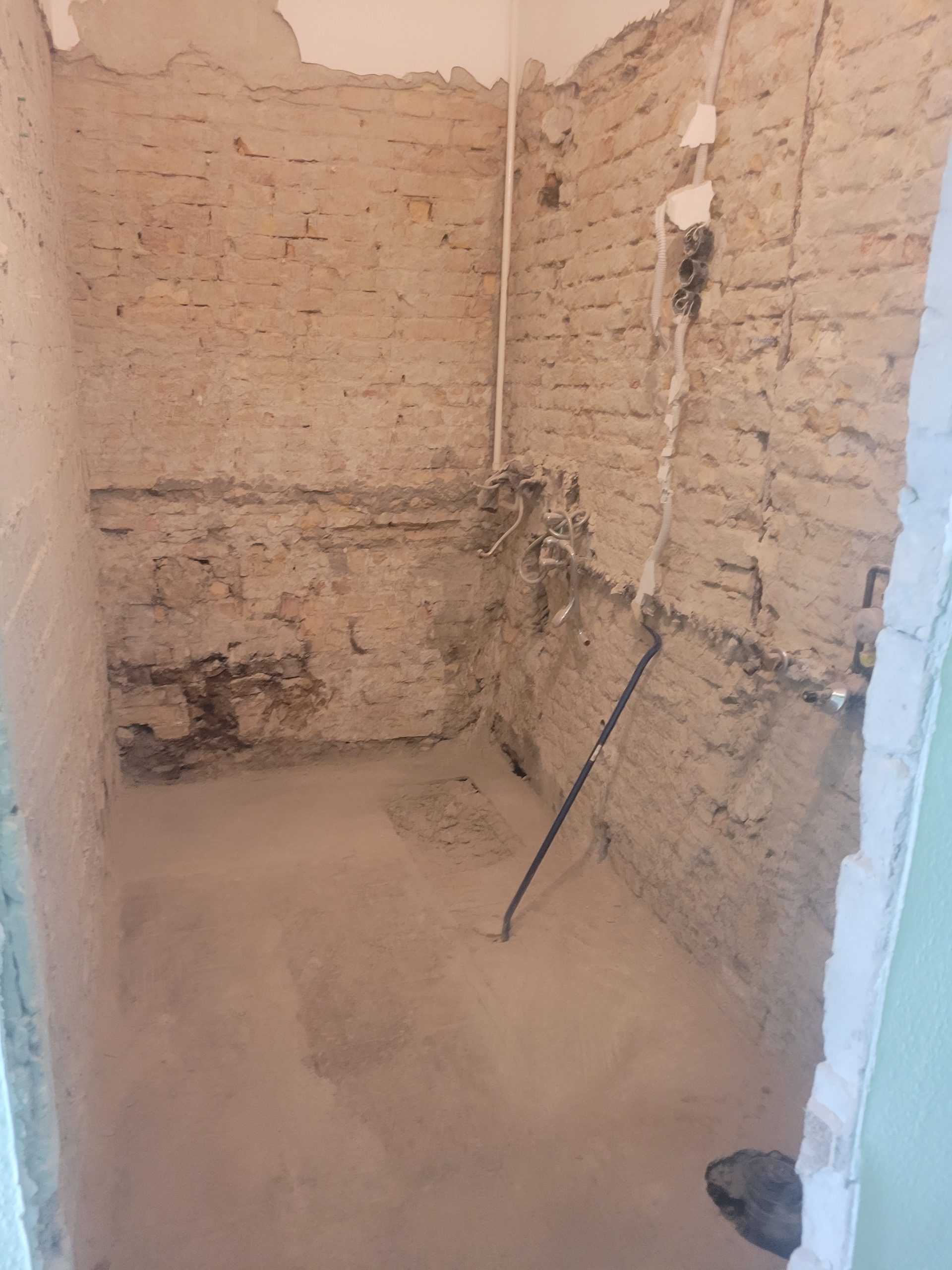 A régi burkolatok, vakolat és szerelvények teljes eltávolítása után új alapfelületek készültek, sima, pontos falakkal.