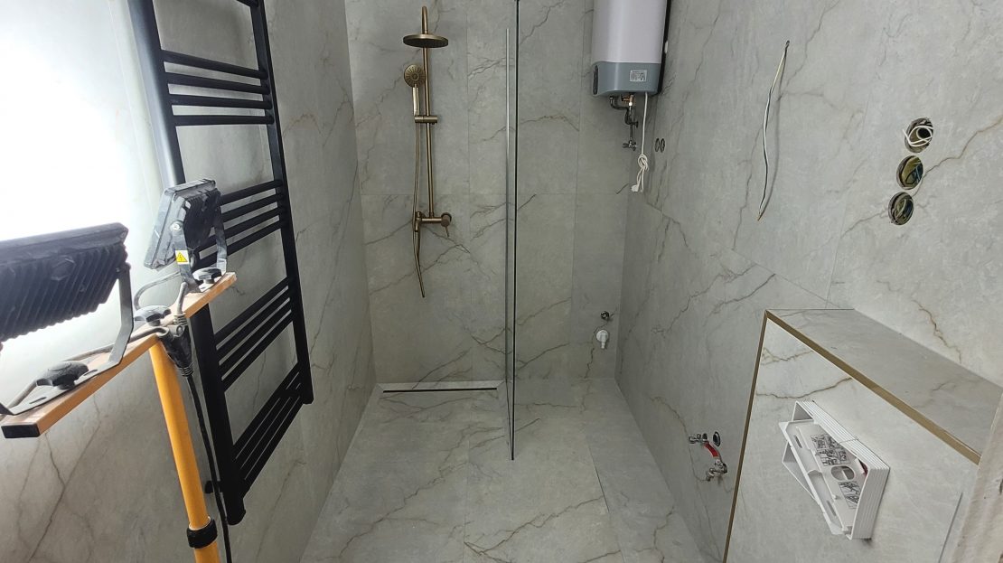 A zuhanyzónál több rétegű professzionális vízszigetelés készült, majd minőségi hidegburkolat (60×120) került a falakra és a padlóra, precíz lapkiosztással, fugamentes hatással.