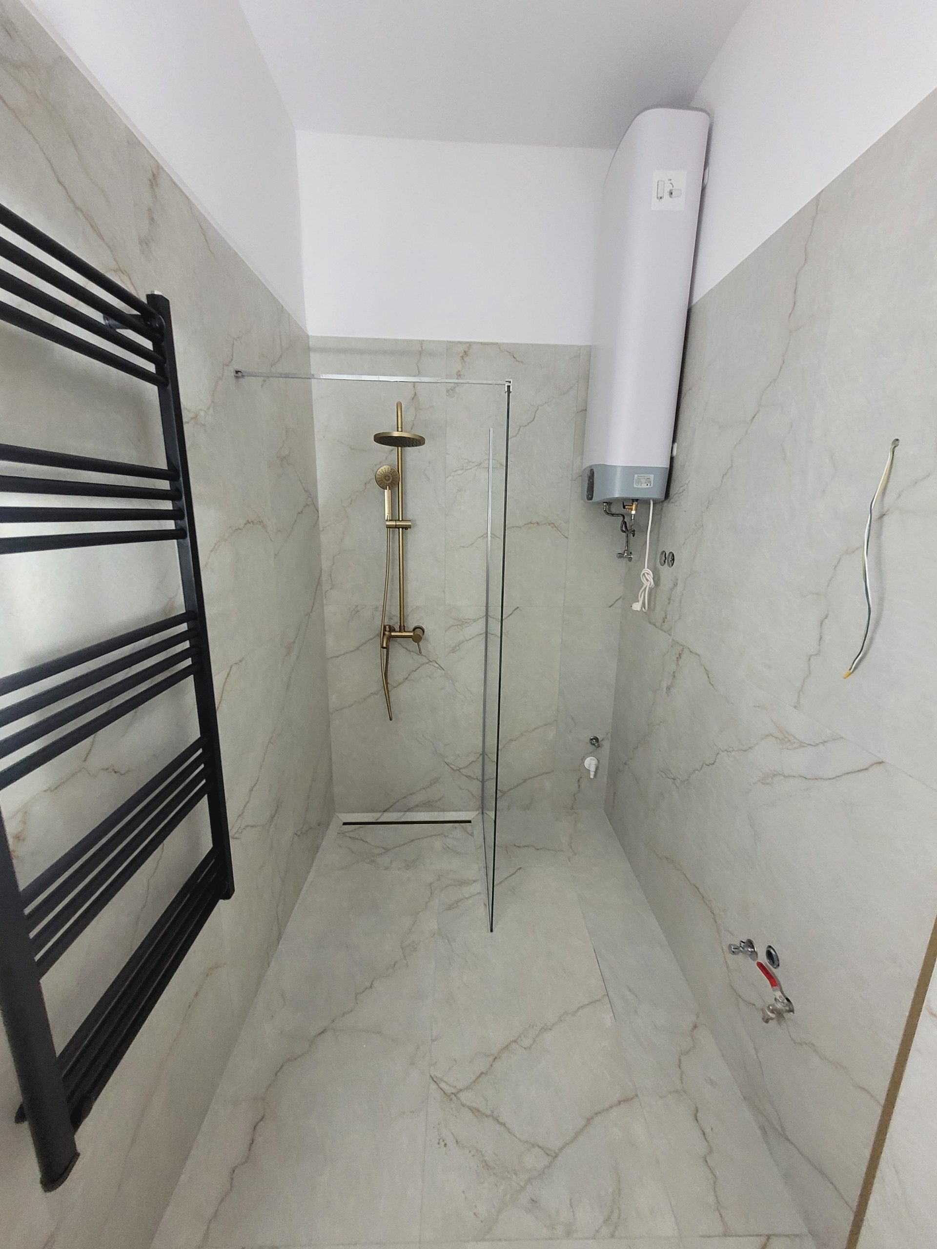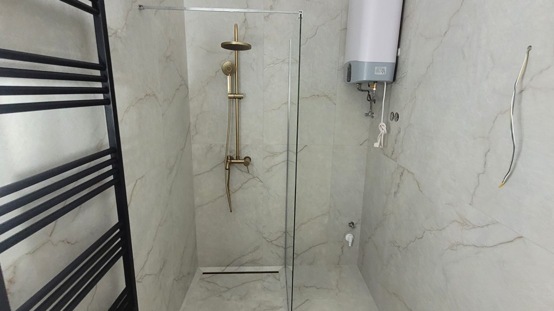 Az épített zuhany padlószintbe süllyesztett lefolyóval, biztonsági üvegfallal és modern vízelvezető rendszerrel készült – egyszerre praktikus és esztétikus megoldás.